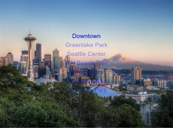 The app has photos of six great places to explore in Seattle, Washington. It's been said a picture is worth 1,000 words. The main screen has a changing background animation as the user hovers the mouse over the place name. (Desktop/Laptop Only) Each place page has a photo stack that pops out to reveal relevant photos.