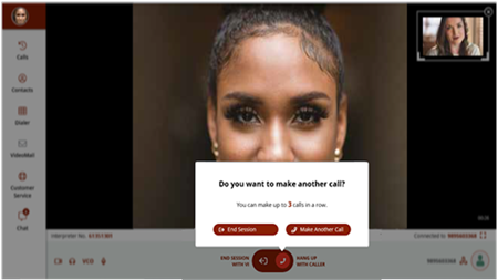 24/7/365 Call Connection Connects with an interpreter in real-time to make telephone calls in sign language (ASL to English and LSQ to French).