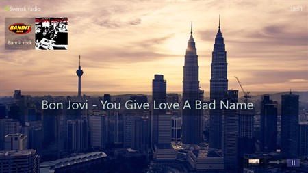 Översikten "Nu spelas" anger program eller låt som spelas för dom flesta kanaler. Helskärm uppspelningsläge med val av bakgrunder (Windows Desktop).