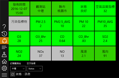 此app用來查詢、訂閱由台灣環保署所提供之觀測站所測得的每小時之空汙資訊,如即時AQI、PM 2.5濃度。