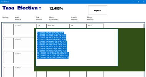 TasaEfectiva! permite calcular el interés efectivo según un monto inicial, cantidad de períodos y una tasa nominal POR PERÍODO. Muestra el detalle de cada período con sus montos y tasa efectiva a cada período. Puede considerar los períodos como mensuales, o si recibe intereses semanales, diarios. quincenales, etc.. Ud. ingresa el monto inicial cantidad de períodos y la tasa nominal de cada período. para versión 10240 o superior. X86