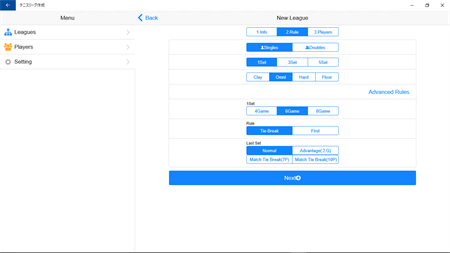 Round Robbin - Up to 20 players and pairs - 1,3,5 Set Match - Select singles and doubles - Input tie-break point - Input surface - Input player info(backhand, play style) - Analysis graph