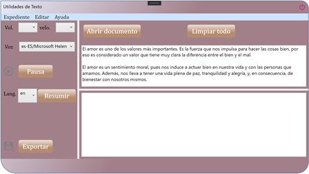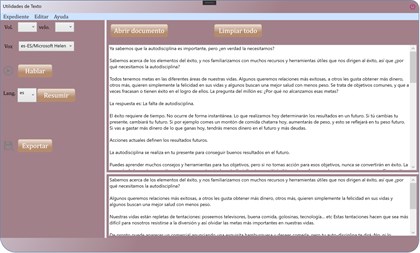 Utilidades de Texto es una aplicación que básicamente puede leer texto en voz alta para el usuario en diferentes idiomas. El usuario puede cambiar los parámetros como volumen, tasa, elegir voz masculina o femenina, etc. Además, la aplicación también consta de un potente resumen de texto. Todo lo que el usuario tiene que hacer es escribir, pegar o abrir un archivo de texto y decidir si escuchar el texto o resumirlo. El texto se resume automáticamente en las oraciones más esenciales, alrededor del 20% de su contenido original, gracias a un algoritmo inteligente. El texto resumido se puede exportar directamente dentro de la aplicación.