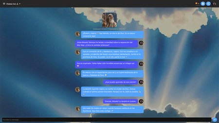 Nuestro chatbot de última generación asegura que cada conversación sea personal, auténtica y guiada por la sabiduría de las Escrituras. Profundiza en la vida de las figuras bíblicas y busca respuestas a las preguntas más profundas de la vida en tiempo real.