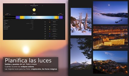 - Sabrá cuándo serán las salidas y entradas del sol y las horas de las mejores luces del día.
