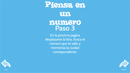 La aplicación que puede leer tu mente! Elija un número, siga las instrucciones y busca la ciudad que corresponde a tu número, la aplicación adivinarà la ciudad correspondiente! Pruébalo ahora!
