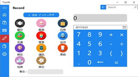 你是否为每天花钱如流水而感到苦恼?想要记录每天的收入与开支情况吗?现在好了,不用再为此烦恼了,TinyLife作为一款简单便捷的记账软件,帮助你记录每天的收支情况,帮助你精打细算,成为你精简持家的好帮手! TinyLife内含账单记录功能,可以记录每天账目的收支情况,且提供满足需求的智能计算器功能,再也不用记账的同时还要手按计算器了! TinyLife内含图表分析功能,从年、月、周三个方面利用折线图全面显示您的账目情况,使您对账目一目了然! TinyLife还提供了基本的日期、黄历和快递查询功能,旨在方便您的生活,给您提供全新的体验!