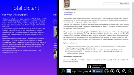 The program based on and on materials "Total dictation" - the annual educational event urged to draw attention to the literacy questions enjoying wide popularity in Russia and in many countries where there live people, not indifferent to Russian. The user has opportunity to choose one of dictations, to listen to it by means of the video, to print and independently to check. For relief of understanding of results it is offered to study comments on spelling in each of dictations.