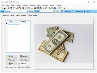 Tracker Ten for Currency is a full-featured database system that tracks all type of banknotes and paper money. You can use the software to easily track your collection for insurance purposes or simply to get organized. The software features advanced reporting, graph generation, item history tracking, customizable data fields, rich text format notes, data export, a powerful search engine, cost and value tracking (based on values you enter yourself), optional web publishing and more. The software can also generate full color reports, incorporating images; great for accurate insurance record keeping and automatic catalog generation.