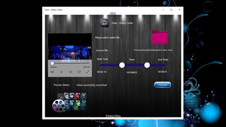 Tube - Video Cutter Features: ------------------------------------- * Simple user interface * Fast video conversion * Supports Video formats including wmv , MP4 , 3gp , flv , avi etc. * Integrated Video Cutter. * Supports multiple video quality. * Fast Video converting for extract video files easily .