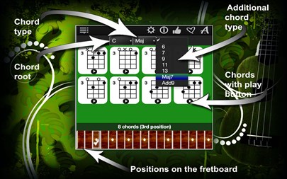 App features: - Number of chords: 24,000. - Supports all ukulele types and sizes: Soprano Ukulele, Tenor Ukulele, Baritone Ukulele, Concert Ukulele and Sopranino Ukulele. - You can listen to each displayed chord. - Drag&Drop selected chord diagrams into editors for your own songbook creations. - Supported 56 chord types: Maj, Maj 6, Maj 7, Maj 9, Maj 11, Maj 13, Maj Maj7, Maj Add9, Min, Min 6, Min 7, Min 9, Min 11, Min 13, Min Maj7, Min Add9, Dim, Dim 6, Dim 7, Dim 9, Dim 11, Dim 13, Dim Maj7, Dim Add9, Aug, Aug 6, Aug 7, Aug 9, Aug 11, Aug 13, Aug Maj7, Aug Add9, Sus2, Sus2 6, Sus2 7, Sus2 9, Sus2 11, Sus2 13, Sus2 Maj7, Sus2 Add9, Sus4, Sus4 6, Sus4 7, Sus4 9, Sus4 11, Sus4 13, Sus4 Maj7, Sus4 Add9, 5, 5 6, 5 7, 5 9, 5 11, 5 13, 5 Maj7, 5 Add9, - Authentic ukelele chord sound - All common ukelele tunings are available: 1. Soprano Standard, 2. Soprano C, 3. Sopranino Standard, 4. Sopranino New, 5. Tenor Low G, 6. Tenor New, 7. Baritone Standard, 8. Baritone Canadian, 9. Open A, 10. Open B, 11. Open C, 12. Open D, 13. Open E, 14. Open F, 15. Open G, - Left-Handed player support, - Volume control