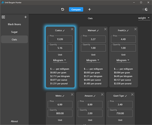 Unit Bargain Hunter makes it easy to compare any number of items to find exactly how they stack up against each other.