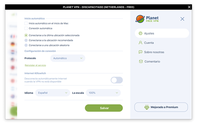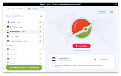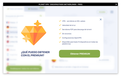 Primer software VPN gratuito Planet VPN: una de las mejores opciones para la seguridad en línea, que brinda acceso completo a cualquier recurso web bloqueado.Utilizamos los protocolos seguros OpenVPN y Shadowsocks, así como el adaptador de red TAP-Windows Provider V9. La aplicación requiere permisos elevados. Mientras oculta su dirección IP real, también obtiene un cifrado de tráfico de grado militar en nuestros servidores. No es necesario registrarse: simplemente instale la aplicación y conéctese a la VPN. Gracias a nuestra aplicación VPN gratuita para Windows, obtendrá total anonimato, ocultará su historial de navegación, encriptará el tráfico y obtendrá acceso completo a sitios web y servicios bloqueados en su país. Planet VPN brinda acceso a sus sitios web favoritos de video o transmisión, rastreadores de torrents y redes sociales: YouTube, Facebook, Twitter, VK, Instagram y otros. Características gratuitas de VPN Planet: - estricta política de no registros; - Cifrado fuerte del disco duro en todos los servidores del mundo; - no se requiere registro ni datos personales; - sin límite de tráfico, tiempo o ancho de banda; - 5 ubicaciones gratuitas para su uso; - servidores de alta velocidad, como la mayoría de los servicios pagos; - soporte para todas las plataformas principales: Windows, Mac, Android, iOS, Linux y navegadores Chrome, Firefox, Yandex, Edge, Opera; - soporte para 10 dispositivos por cuenta premium. ¿Por qué Free VPN Planet es la mejor opción ahora? Obtiene una aplicación totalmente gratuita, completamente funcional e ilimitada con características de marcas premium caras. Al mismo tiempo, tiene la oportunidad de comprar una suscripción premium para obtener aún más funciones de alto valor y acceso a servidores ultrarrápidos en más de 60 países y 5 continentes alrededor del mundo.