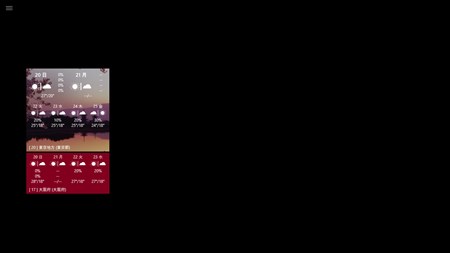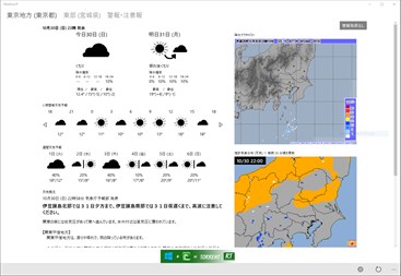 - 概要 このアプリは気象庁提供の情報を利用し、任意の地域の天気予報を表示します。また、天気予報に加えて、アメダス、推計気象分布、気象警報・注意報、天気図も確認できます。ライブタイルをスタート画面に表示して自動更新することで、ライブタイルにて天気予報を確認することもできます。