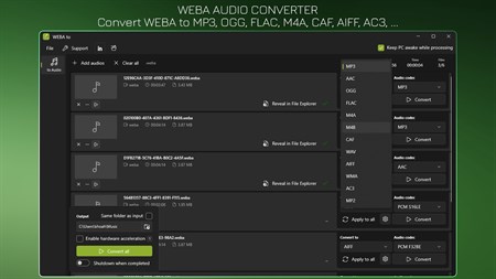 Convert WEBA audio to MP3, AAC, OGG, FLAC, M4A, M4B, CAF, WAV, AIFF, WMA, AC3, MP2. ???? Convert multiple files at once, there's no limit to how many files. ???? All processing is performed locally on your computer where your files remain safe and private.