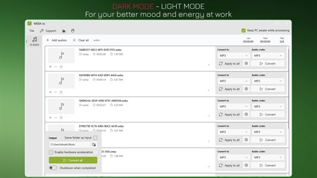 • Enable hardware acceleration to save time. • Auto shutdown when completed. • Save time with multiple files processed at once or focusing on a single audio.