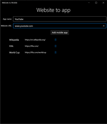 Turn any website into a mobile app on your tablet or Windows phone. Pin tiles and open websites with the mobile experience. Website to Mobile creates a mobile app for any website you wish. You can use it for anything from Wikipedia to specialized websites, such as the World Cup website or even YouTube and Facebook.