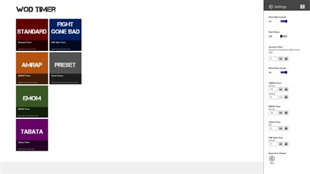 Six Timers: - Standard Count-up. - AMRAP (As Many Reps As Possible). - EMOM (Every Minute On the Minute). - Tabata - Fight-Gone-Bad Style. - Preset Timers for Warm-ups and Stretching