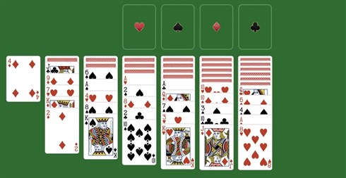 The tableau consists of seven tableau piles, with the first pile containing one card faced up, the second containing two cards faced down, the third containing three cards faced down and so on, up to the seventh pile containing seven cards faced down. The first tableau pile has only one card faced up and the rest of the piles have five cards each faced up.