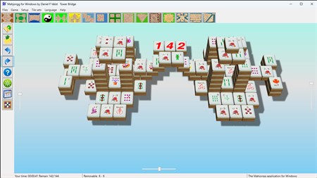 Mahjong solitaire is a solitaire matching game that uses a set of mahjong tiles rather than cards. The 144 tiles are arranged in a special four-layer pattern with their faces upwards. A tile is said to be open or exposed if it can be moved either left or right without disturbing other tiles. The goal is to match open pairs of identical tiles and remove them from the board, exposing the tiles under them for play. The game is finished when all pairs of tiles have been removed from the board or when there are no exposed pairs remaining. Tiles that are below other tiles cannot be seen. But by repeated undos and/or restarts which some programs offer, one gradually gets more and more information. Sometimes, tiles are only partially covered by other tiles, and the extent to which such tiles can be distinguished depends on the actual tile set. This version of Mah jongg solitaire provides 13 missions and seventeen languages support.It is able to build solvable games by reverse playing. You can also build random games. Undo and redo feature can be very valuable when you find yourself trapped. The desktop version includes mouse emulation for disabled peoples and keyboard shortcuts to play faster.