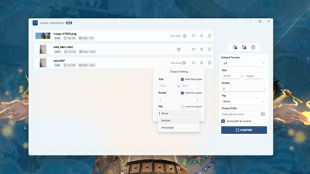 Key Features 1.Offline convert 2.Batch convert, high performance 3.Support almost all image formats available(jpg, png, bmp, ico, heic, heif, webp, psd etc.) 4.Support output formats: jpg, png, bmp, svg, webp, gif, ico, tiff pdf etc 5.Support custom size 6.Support rotate 7.Support flip