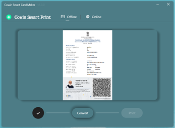 Features : Provides an Modern GUI Win 11 Style Themes and Dynamic Color Changes Supports all the CoWIN Certificates Can be converted to Smart Cards or Paper Cards Supports all the Smart Card Printers Legacy Printing or Modern Printing both suppoerted