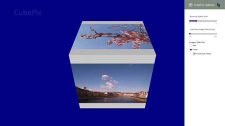 CubePix is a new and creative way to view your photo album instead of having a plain slide show that goes from picture to picture without much customization. CubePix is entertaining because all selected images will be displayed on a rotating cube bouncing around the screen.