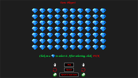 This app is created by PRABAL GHURA, a student of B.Tech(Computer Sciences) at DAV Institute of Engineering & Technology for 2nd round (app submission) of MSP selection. This app is a 2-player game, based on picking diamonds winner being the one who picks the last diamond. You can choose various game types (playing v/s computer or another human player). There are 4 different board sizes available for the game.