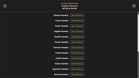 Content: Chinese-Russian dictionary & Russian-Chinese dictionary, ZH-RU (>50 000), RU-ZH (>52 000). Czech-Russian dictionary & Russian-Czech dictionary, CS-RU (>34 000), RU-CS (>53 000). Dutch-Russian dictionary & Russian-Dutch dictionary, NL-RU (>40 000), RU-NL (>55 000). English-Russian dictionary & Russian-English dictionary, EN-RU (>67 000), RU-EN (>75 000). Finnish-Russian dictionary & Russian-Finnish dictionary, FI-RU (>39 000), RU-FI (>51 000). French-Russian dictionary & Russian-French dictionary, FR-RU (>31 000), RU-FR (>53 000). German-Russian dictionary & Russian-German dictionary, DE-RU (>43 000), RU-DE (>53 000). Greek-Russian dictionary & Russian-Greek dictionary, EL-RU (>33 000), RU-EL (>48 000). Hindi-Russian dictionary & Russian-Hindi dictionary, HI-RU (>37 000), RU-HI (>46 000). Italian-Russian dictionary & Russian-Italian dictionary, IT-RU (>28 000), RU-IT (>53 000). Japanese-Russian dictionary & Russian-Japanese dictionary, JA-RU (>35 000), RU-JA (>45 000). Korean-Russian dictionary & Russian-Korean dictionary, KO-RU (>59 000), RU-KO (>53 000). Malay-Russian dictionary & Russian-Malay dictionary, MS-RU (>20 000), RU-MS (>51 000). Polish-Russian dictionary & Russian-Polish dictionary, PL-RU (>44 000), RU-PL (>54 000). Portuguese-Russian dictionary & Russian-Portuguese dictionary, PT-RU (>35 000), RU-PT (>57 000). Spanish-Russian dictionary & Russian-Spanish dictionary, ES-RU (>36 000), RU-ES (>57 000). Swedish-Russian dictionary & Russian-Swedish dictionary, SV-RU (>36 000), RU-SV (>49 000). Thai-Russian dictionary & Russian-Thai dictionary, TH-RU (>47 000), RU-TH (>54 000). Turkish-Russian dictionary & Russian-Turkish dictionary, TR-RU (>45 000), RU-TR (>57 000). Vietnamese-Russian dictionary & Russian-Vietnamese dictionary, VI-RU (>45 000), RU-VI (>41 000).