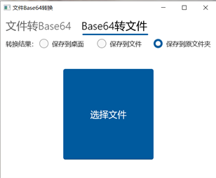 本软件用于将文件转换成Base64字符串,以及将Base64字符串转换成文件。 注意:仅支持将本软件生成的Base64字符串转换成文件。