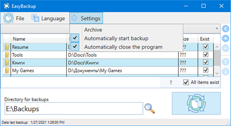 If you have a group of files and folders scattered throughout the computer, and you need (and you should :)) to make regular backups, then you can make them easier and faster using this program. “Easy Backup” allows you to create a saved list of files and folders that will be copied to the specified address. The path for the backup is also saved. It is possible to immediately create their archive versions, to save memory (optional). Everything is very simple: you just need to set up a list of files and folders once, select a folder for backups, and then click a button. The program itself will close when copying is completed (optional). The next time you start the program, you don’t have to configure anything. If there is not enough space, old backups will be deleted (optional). You can save and use several similar sets.