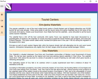 Educational tourism is developed because of the growing popularity of teaching and learning of knowledge and the enhancement of technical competency outside of classroom environment. In educational tourism, the main focus of the tour or leisure activity includes visiting another country to learn about the culture, study tours, or to work and apply skills learned inside the classroom in a different environment. It also important to note that this App focuses on e-discovery which can also be termed as e-learning method of learning.