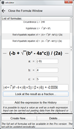 The Formula Calculator allows you to calculate long mathematical expressions and formulas almost in the form they are usually written on paper, using both simple actions and functions, with unlimited nesting of parentheses. Intermediate value is supported. Contains many fine settings for outputting results. It allows to calculate prepared formulas with an unlimited number of variables. Such formulas can be made and saved by yourself. Absolutely free and no any adverts!