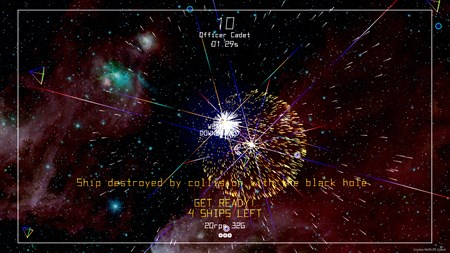 Destroy alien spacecraft-emitting vortices quickly. Beware of the gravity and anti-gravity black hole. Be sure to clear each level before the timer reaches zero. Avoid bullet-resistant magnetic mines. Use your shield to protect against collisions and mine detonations.