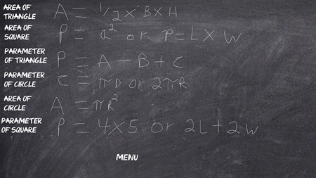 This is the Geomtary App it helps students understand the formulas to problems involving the parameter of a square, circle, triangle, as well as area of square, circle, and triangle. Not only does it help understand the formulas but it also useful to double check your homework. The app is fun and easy way to get your Geometry homework done as well help you study for your Geometry exam. Enjoy!
