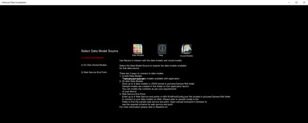 User can select data from 3 different data sources: 1. Web Service End Point 2. JASON file stored on disk 3. Built-In Data Model