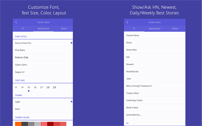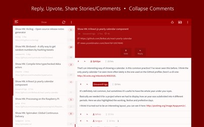 • Share stories and comments • Articles are presented in a readable mode using readability. • Options to open other links in built in or external browser • Poll result as a bar chart • Tap on the "Time ago" in the comment to collapse the comment and replies • Tap on the user id to see user's profile