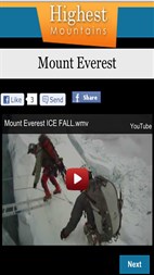 • 1. Explore the 30 Highest Mountains • 2. Watch Amazing Videos of actual Mountain climbs • 3. Gain knowledge about notable Mountain explorers • 4. Take the Mountain Knowledge Quiz • 5. Interact with people of common Mountain exploring interests • 6. Bookmark pages • 7. Share your Mountain knowledge with others