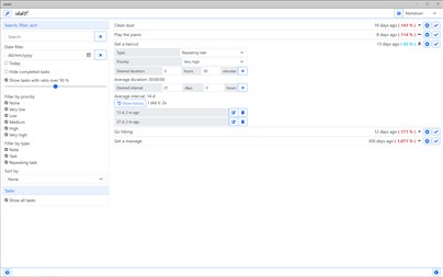 Set the desired interval for your habits (repeating tasks) Compare the average interval with the desired interval See when you last completed a task and how that compares to the desired interval