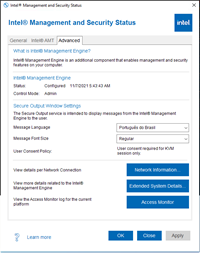 "The Intel® Management and Security Status icon indicates whether Intel® Active Management Technology, Intel® Standard Manageability and Intel® Anti-Theft Technology are running on the platform. The icon is located in the notification area. By default, each time Windows* starts, Intel® Management and Security Status application starts and the notification icon is displayed."