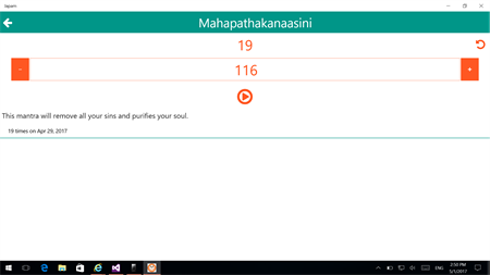 Japam will take your input of a mantram and repeats it specified number of times so that you can recite in sync which will give you more concentration as well as exact count of your japam. By default we have provided some default mantras which will be helpful for many daily life problems. You can also load mantras recorded in external app to Japam