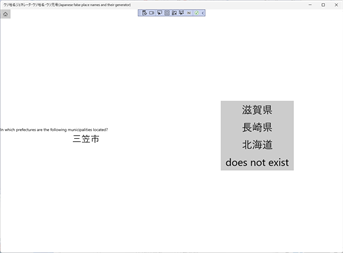 False place name generator: A generator that randomly generates (character strings of) prefectures and city names that do not actually exist. False Place Name: A quiz app that answers non-existent place names, and a quiz app that answers non-existent municipalities in prefectures. Uso era name: A quiz game app that chooses an era name that has never been used.