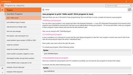 This Java Programming app enables you to carry Java programming Tutorials in your device. It contains many Important programs. This app has a very simple user interface and the contents can be easily understood by the users.