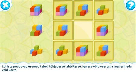 See mäng sisaldab üle 20 mängutüübi: - arva ära, kuidas mingi kujund ülevalt või alt välja näeb - leia kaks tükki, mis kokku moodustavad ruudu - jätka kujunditest mustrit - arva ära, milline muster teeb kokku kuubiku - kujunditega sudoku - määra ära, mitmest ruudust kujund koosneb - leia kujund, mis ei sobi - leia sarnased kujundid