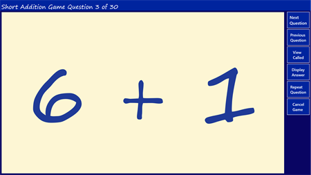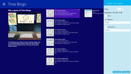 At the minute there are 6 types in the game: Maths: The computer calls sums and the players make off the answer. Alphabet: The computer calls out a letter and the players mark it off their card if they have it. Word: the computer calls out a word and the players mark the first letter or the whole word on their card. Time: the computer calls out a time or a time sum and the players mark the answer on their cards. Picture: the computer displays a picture and the players mark off the word or the computer displays a word and the players mark of the picture. Money: The computer displays 2 coins and the players mark off the sum on their cards.