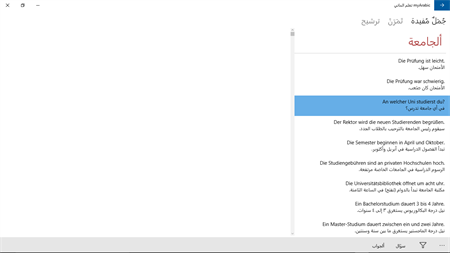 تطبيق من مجموعة myArabic يهدف لتسهيل تعليم اللغة الالمانية للناطقين بلغة الضاد وكمرافق للمتعلم على الأجهزة المحمولة. Die App kann auch mit einer deutschen Oberfläche verwendet werden. أن هناك العديد من ألوظائف الممكنة ومواد تعليمية مبسطة ومنها: - عرض الفقرات كألكلمات بتصنيف مختلف. - معلومات قواعدية ولغوية - الابجدية الالمانية - مفردات من اللغة الألمانية - بعض الألوان بأللغة الألمانية - الأعداد في اللغة الالمانية - وظيفة البحث في المفردات - محرر الكلمات، وظيفة أدخال كلمات خاصة بك - الأعدادات: المتحدث واحصائيات التعلم - أزرار تصفج ألكلمات/الأحرف - عرض جمل مفيدة (ما يقارب 1000) ونطقها - باب التمرن على تشكيل جمل وأختبارها - باب ترشيح الجمل(فلتر) والبحث السريع عنها - معلومات عامة وضروربة عن المانيا