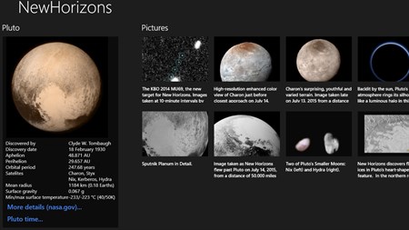 The application shows time elapsed from closest approach to Pluto, distance to that dwarf planet and speed of the probe. App shows also pictures taken by New Horizons and latest news from the mission team.