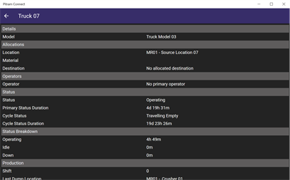 Pitram Connect provides insight into your mine site at your fingertips. The mobile application will allow users to retrieve information about their assets (people, equipment, production, locations, time allocations) without directly impacting mine control personnel or having to be at a workstation. For example, a production supervisor would like to know the mines current production delivery to the production plant, quickly determine the status of a location, know the amount of time a truck has been on delay or which operator is on a piece of equipment.