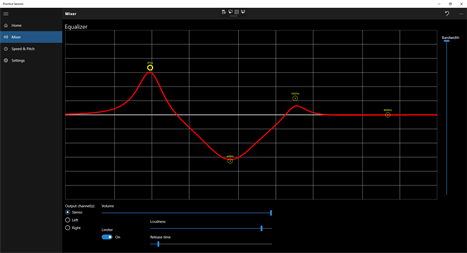 This application will allow you to select a fragment from a song, change pitch and speed and play it in loop. You can then play along and learn how to play more difficult parts in a more easy way. Changing the pitch and speed will require you to optionally buy a Pro add on. In addition you can also boost the right instruments using 4 band equalizer and select left or right channel to play separately. The Pro version will also allow you to save the fragments and thus quickly move from one part of a song to another. You can try the pro features for free for 14 days.