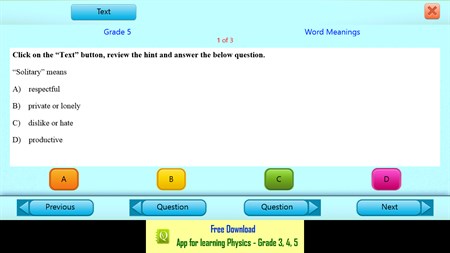 This app is for kids in fifth grade or grade 5 and allows you to perfect you english verbal skills on the go on your smart phone or on your tablet. The app conforms to ELA common core tests and is also suitable for training and preparation for tests conducted by John Hopkins Center for talented youth CTY (SCAT), Naglieri Nonverbal Aptitude test (NNAT) and Iowa Test of Basic Skills (ITBS).